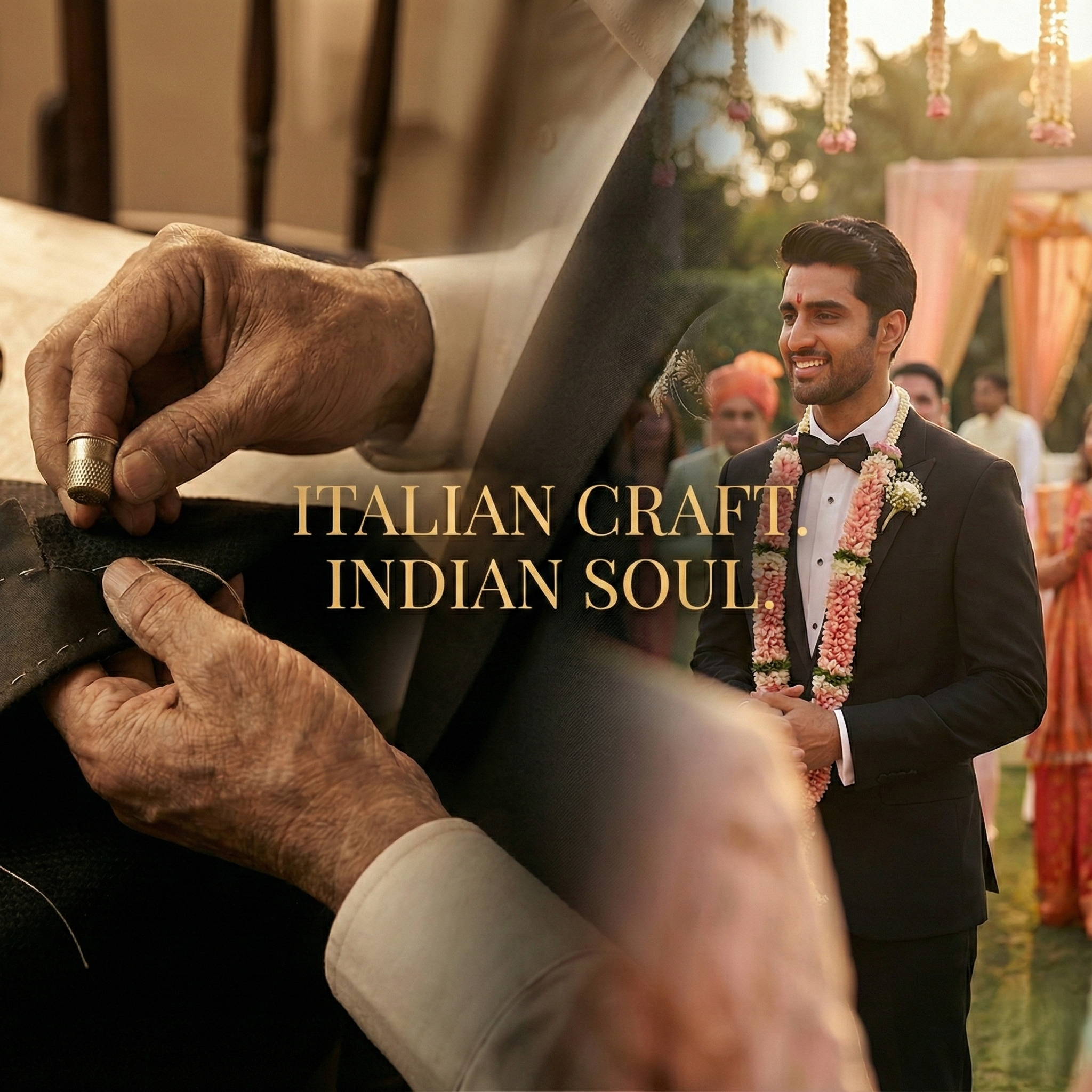 Crafted elegance inspired by Italian mastery and Indian heritage. Designed for the groom who deserves to feel confident and celebrated.